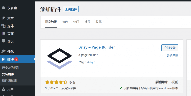 我们来告诉你如何激活brizy-pro 插件,首先我们要再后台安装 brizy 免费版插件,在后台直接搜索 brizy 插件安装,brizy提供免费版与pro版本,免费版功能也比较丰富,如果没有特殊要求与预算费用,可以使用免费版本。