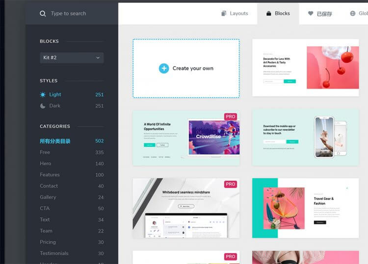 安装后编辑页面使用 brizy,里面有很多模板及“块”,带pro角标的免费版不能使用。不过免费版本也是比较多的。