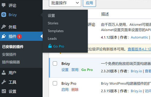 上传安装专业版插件,后台直接上传,在没激活时,免费版本后面有 Go Pro 链接,点击会跳转到官方购买页面,启用 Brizy Pro 后,就不会显示了