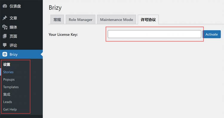 启用后,Brizy 菜单会出现新的功能菜单,点击设置->许可协议,输入激活码,激活就可以使用Brizy-Pro 的高级功能了