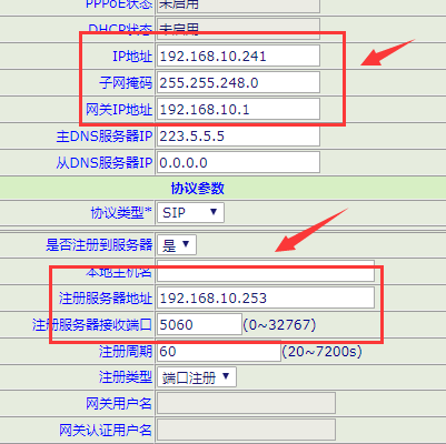 1、登录后设置设备的IP 地址,如果不知道管理员帐户可以充值,这款设备的IP 地址查询方法为 按 ***#,第一个红框为 MG3000 的网络参数,第二个红框为 呼叫中心的IP地址,用于注册话机