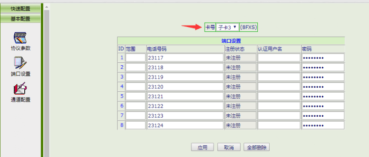 2、设置话机端口,点击基本配置/端口设置,填写用于注册的相关信息。填写正确后,注册状态会显示 已注册。