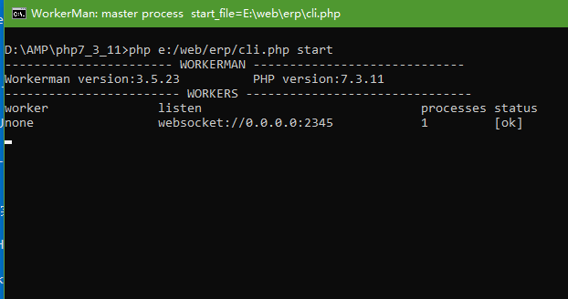 在命令行输入 php cli.php start 检查 是否运行,出现下图这样说明配置成功,如果出现错误,请检查 php是否能执行,文件目录是否正确