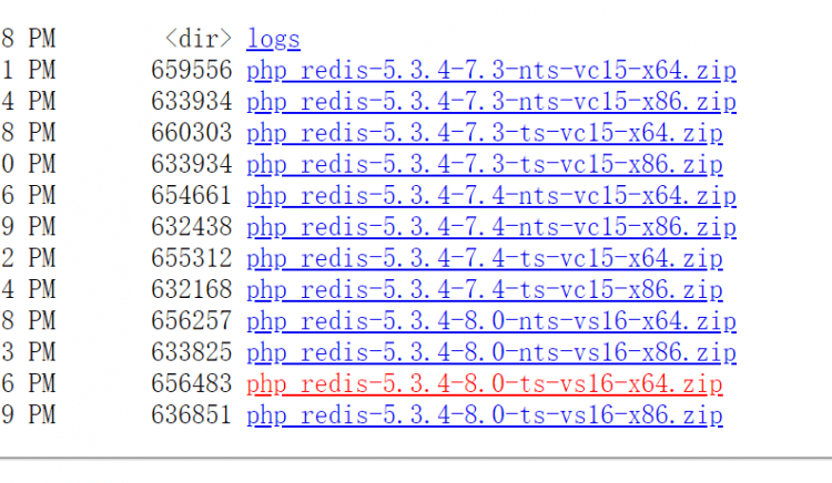 添加PHP的redis 扩展,首先下载扩展包,下载页 https://windows.php.net/downloads/pecl/releases/redis/ 选择相应的版本,我们选择的是5.3.4版本,点击进入下载页,选择对应的 PHP、vs 版本,我们选择的收PHP8,VS16 TS的版本,如果不知道可以使用phpinfo(),输出相应的信息
