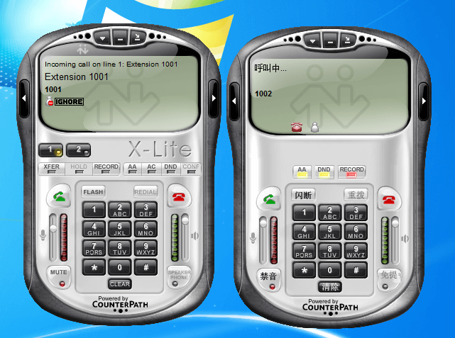 注册好后两台话机就可以相互拨打了,右侧为1001 ,拨打左侧 1002