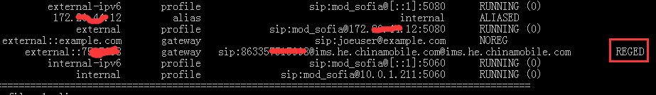 显示 REGED ,为注册成功,配置好 呼入呼出路由即可实现通话了