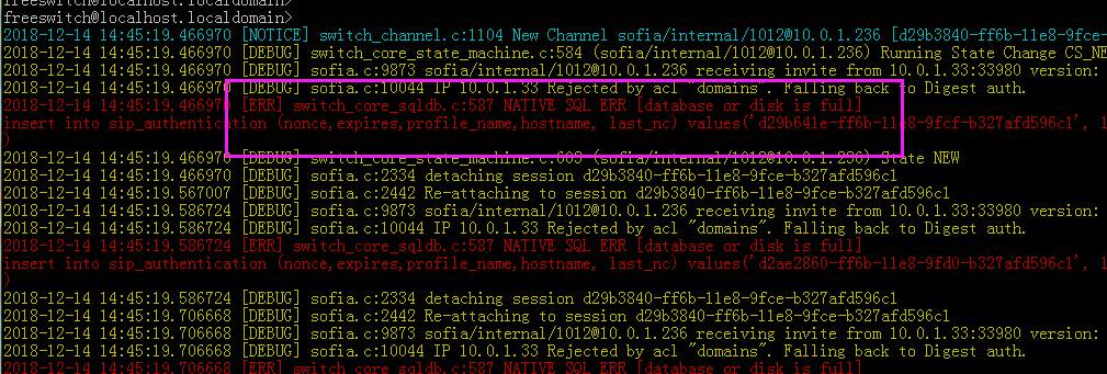 公司呼叫系统,在正常使用中突然大面积出现呼叫失败,马上登录服务器查看呼叫日志,出现下图所示的 (NATIVE SQL ERR [database or disk is full])